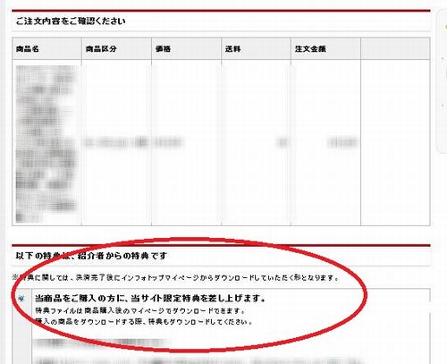 決済画面にて必ず「当商品をご購入の方に、当サイト限定特典を差し上げます。」の表示(赤丸部分)があることを確認してからお申し込みください。